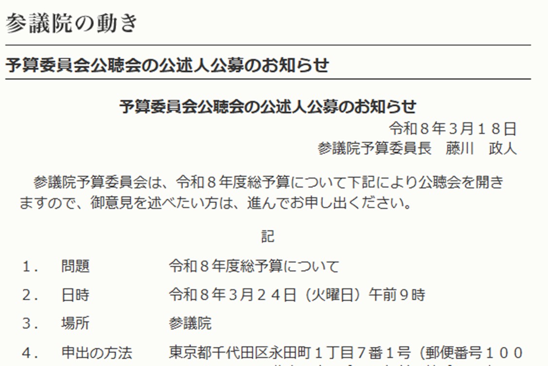 予算委員会公聴会の公述人公募のお知らせ(令和8年3月18日)
