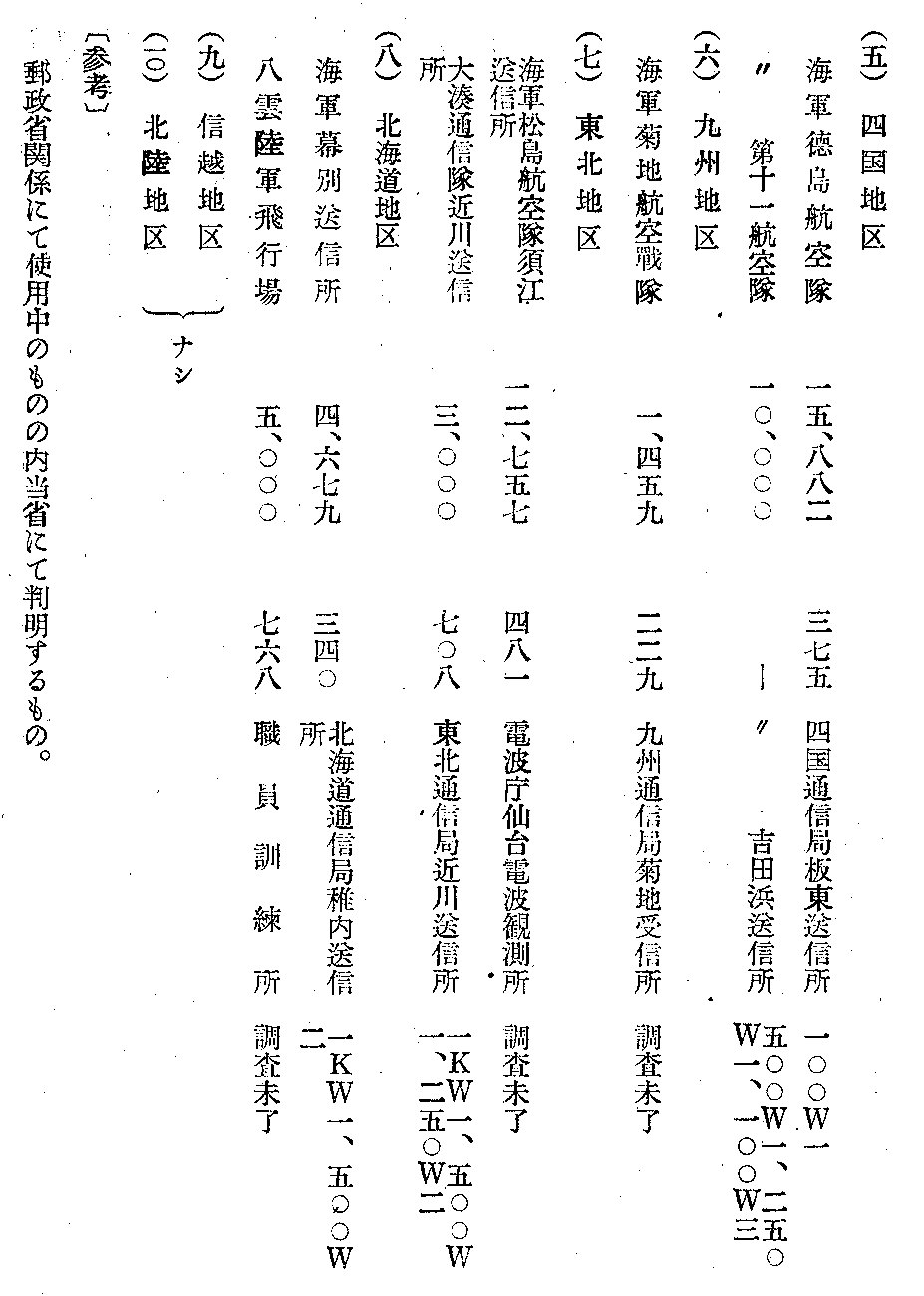 | 答弁書第五号 内閣参甲第一二九号 昭和二十四年十一月四日 内閣総理大臣 吉田 茂 参議院議長 松平 恒雄 殿 参議院議員小林勝馬君提出旧軍部における無線施設に関する質問に対し、別紙答弁書を送付する。 参議院議員小林勝馬君提出旧軍部に於ける無線施設に関する質問に対する答弁書 (一)(1) 旧軍用無線施設は終戦に伴つて大蔵省所管の普通財産となつて管理されているが施設の特殊性に鑑み極力無線施設として今後も継続して活用することが望まれその転活用については電気通信省その他に所管換貸付又は売払する方針のもとに処理してきている目下大蔵省において判明しているものは電気通信省が現在使用しつつあるものでその内容は別紙一号調書の通りである。全国に亘る施設については各地方の財務部が現実の管理に当つている関係から大蔵省において把握していないので若し調査の要ありとすれば各財務部に照会する必要があり相当の日時を要するものと考えられる。 (2) 電気通信省において判明している通信施設の配置状況は別紙二号調書の通りである。 (3) 土地建物の管理も各地方の財務部が行つており全国の状況は直ちに判明しないが現在電気通信省が使用中のものについては別紙一号調書の通りである。 (4) 終戦後連合軍側より当時の内務省が受領し更に内務省から電気通信省に引継いだ無線機器は無線施設に含まれる機器を除いたもので其の種類及び数量は別紙三号調書の通りである。 (二)(1) 無線機器の処分状況は別紙三号調書の通りであり其の利用状況については一般無線通信用或は無線機器の製作又は修理用の部分品として使用せられ通信復興に大いに寄与している。 (2) 全国に亘る土地建物の管理及び処分については各地方財務部に照会を要するが電気通信省が利用中のものは別紙一号調書の通りである。 別紙一号調書 旧軍用無線施設の種類規模装備及び之が利用状況 1/4 別紙一号調書 旧軍用無線施設の種類規模装備及び之が利用状況 2/4 別紙一号調書 旧軍用無線施設の種類規模装備及び之が利用状況 3/4 別紙一号調書 旧軍用無線施設の種類規模装備及び之が利用状況 4/4 別紙二号調書 旧軍用通信施設名一覧表 1/8 別紙二号調書 旧軍用通信施設名一覧表 2/8 別紙二号調書 旧軍用通信施設名一覧表 3/8 別紙二号調書 旧軍用通信施設名一覧表 4/8 別紙二号調書 旧軍用通信施設名一覧表 5/8 別紙二号調書 旧軍用通信施設名一覧表 6/8 別紙二号調書 旧軍用通信施設名一覧表 7/8 別紙二号調書 旧軍用通信施設名一覧表 8/8 別紙三号調書 旧軍用無線通信機器引継総数及配分状況調書 |