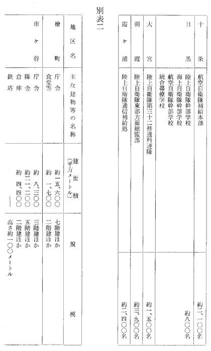 五について 防衛庁としては、現在、情報関係組織の在り方について検討を行っているが、いまだその内容を申し述べる段階にない。 六について 移転計画により施設の再配置を実施した後の各地区ごとの主な再配置機関等の名称及び所在人員数は、別表一のとおりである。 七について 檜町、市ケ谷、十条、目黒、大宮、朝霞及び霞ケ浦地区の主な建物等の名称、建面積及び規模は、別表二のとおりである。 八について 移転計画による施設整備については、昭和六十三年度から着手しており、同年度予算においては市ケ谷、十条、目黒、大宮、朝霞及び霞ケ浦の六地区に係る調査工事費及び基本設計費を計上し、また、平成元年度予算においては同六地区に係る環境調査費並びに大宮、朝霞及び霞ケ浦の三地区に係る実施設計費を計上したところである。