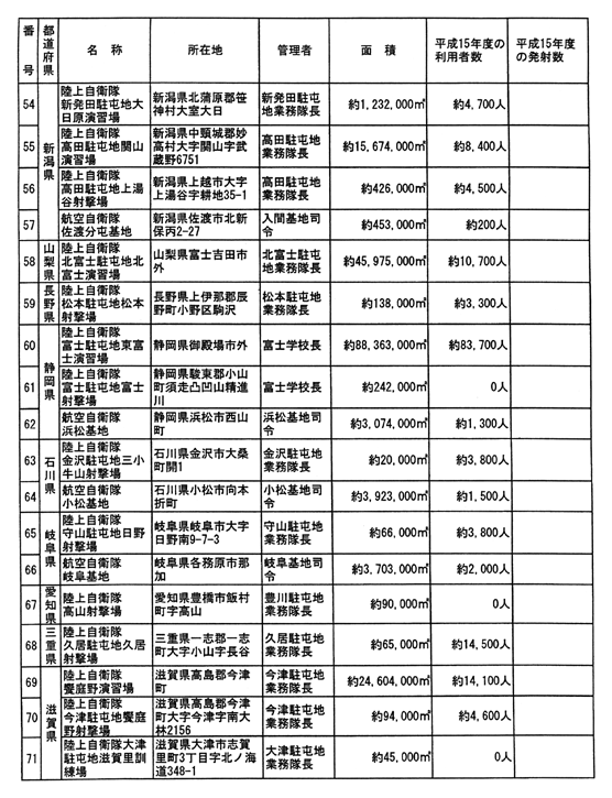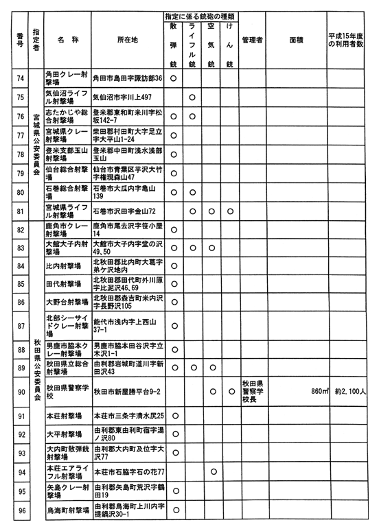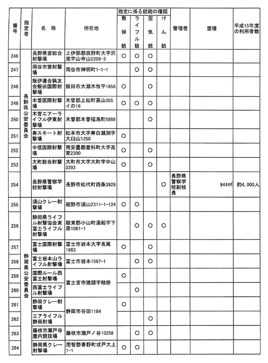 参議院議長 倉田 寛之 殿 参議院議員谷博之君提出鉛弾の全面禁止に関する質問に対し、別紙答弁書を送付する。 参議院議員谷博之君提出鉛弾の全面禁止に関する質問に対する答弁書 一について 環境省(平成十三年一月五日以前は環境庁。以下同じ。)において、鳥類の鉛中毒の防止に関してこれまで講じられた施策は、別表第一のとおりであり、鳥類の鉛中毒防止に関する施策を実施するために要した経費は別表第二のとおりである。 二について 環境省において情報収集を行った結果によれば、全国の都道府県及び北海道内の各市町村において、鳥類の鉛中毒の防止に関して平成元年以後講じられた施策は別表第三のとおりである。 三について 環境省においては、狩猟のための水辺域における鉛製散弾の使用については、非鉛弾の普及状況等を勘案しつつ、しかるべき時期に全域で禁止することとしているところである。水辺域における鉛製散弾の使用禁止に関しては、狩猟者が非鉛弾の使用に慣れていないこと及び非鉛弾の製造・供給体制が整っていないこと等の課題があると認識しており、関係者の理解を得て非鉛弾の普及を図る必要があること等から、現段階で具体的なスケジュール及びそのための予算をお示しすることは困難であるが、これが早期に実現するよう努めてまいりたい。 なお、水辺域全域における鉛製散弾の使用の禁止に至るまでの当面の措置として、各都道府県において、鳥獣の保護及び狩猟の適正化に関する法律(平成十四年法律第八十八号。以下「新法」という。)による改正前の鳥獣保護及狩猟ニ関スル法律(大正七年法律第三十二号)第一条ノ五第五項に基づく狩猟鳥獣の捕獲制限として鉛散弾規制地域を指定したり(この指定は、新法施行後も効力を有している。)、新法第十五条第一項に基づき鉛製散弾の使用を禁止する指定猟法禁止区域を指定する措置を行っている。その結果、各都道府県において、鉛製散弾の使用が禁止される地域・区域として、平成十六年五月現在、全国で約百四十か所、約七万八千ヘクタールが指定されている。さらに、環境省においては、各都道府県に対し、この区域の拡大を要請しているところである。 また、北海道内において鉛製銃弾が原因と見られる猛禽類の鉛中毒が発生していることから、北海道においては、エゾシカ猟における鉛製銃弾の使用を禁止しているものと承知している。北海道内以外において、今のところ猛禽類の鉛中毒は報告されていないが、環境省において引き続き情報収集を行ってまいりたい。 その他、狩猟において鉛弾から非鉛弾(鉛を含むが、鳥獣の捕獲に当たって、鉛が暴露しない構造・素材の銃弾を含む。以下、三についてで同じ。)への使用の切替えを進めることは、鳥獣の保護を図る上で重要な課題と認識しているところであるが、関係者の理解を得て非鉛弾を普及させることが必要であることから、引き続き狩猟者への情報提供及び関係団体への申入れ等の取組を着実に進めてまいりたい。 四について 新法第七条の特定鳥獣保護管理計画に基づく個体数調整のための捕獲の許可を新法第九条第一項に基づき得た者は、新法第十二条第四項又は第十五条第四項の規定により、鉛散弾規制地域又は鉛弾に係る指定猟法禁止区域にあっても、鳥獣の捕獲をすることができることとされているが、鳥獣の保護を図るための事業を実施するための基本的な指針(平成十四年環境省告示第八十六号)において、環境大臣はこれらの場合においても鉛製銃弾を使用した捕獲は原則として許可しない旨定められている。また、同指針においては、猛禽類の鉛中毒を防止するために、鳥獣の捕獲に当たっては鉛が暴露する構造・素材の銃弾は使用しないよう努めることが、併せて定められているところである。都道府県においても、これらを踏まえた対応がとられているものと認識している。 なお、環境省が昭和六十二年度から都道府県等に対して実施している土壌汚染の状況についてのアンケートによると、射撃場敷地内以外の場所において、鉛製散弾に起因する鉛について、土壌の汚染に係る環境基準について(平成三年環境庁告示第四十六号)に示された環境基準(以下「土壌環境基準」という。)を超える測定値が認められたことはない。 五について 銃砲刀剣類所持等取締法(昭和三十三年法律第六号)第九条の二第一項の規定に基づいて都道府県公安委員会に指定されている射撃場(以下「指定射撃場」という。)は、平成十六年六月十六日現在、全国で四百六十九か所ある。 なお、この指定は銃砲の種類ごとに行われるものであり、同一の射撃場で異なる種類の銃砲に係る指定を重複して受けている場合もあるが、ここではこれを一か所として数えている。 六について お尋ねの「指定の別」とは、指定に係る銃砲の種類を指すものと考えるが、平成十六年六月十六日現在の指定射撃場の指定者、名称、所在地、指定に係る銃砲の種類、管理者、面積及び平成