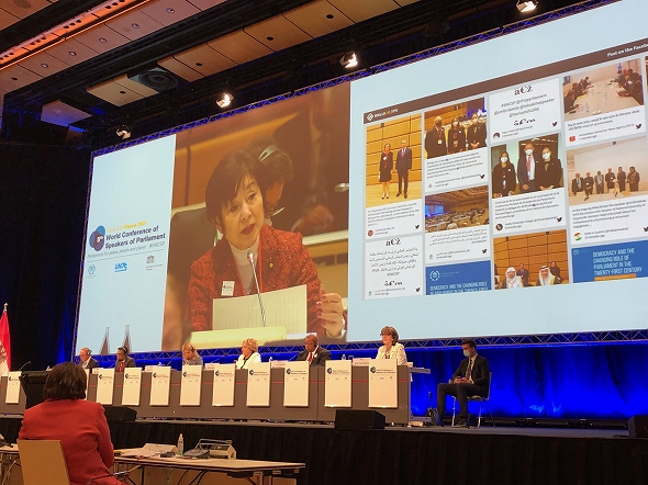 7日及び8日には、世界議長会議が開催され、山東議長は、一般討議「人間及び地球に平和及び持続可能な開発をもたらす、より実効的な多国間主義のための議会のリーダーシップ」及びパネルディスカッション「ポスト・パンデミックの回復:気候変動と闘い、持続可能な開発を促進するための経済転換」において、それぞれ発言を行いました。
